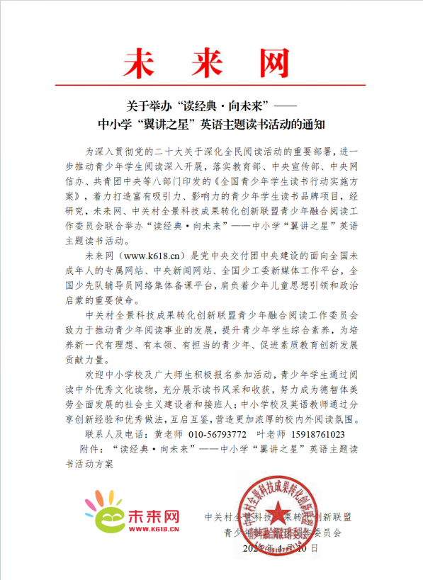 关于举办“读经典·向未来”—— 中小学“翼讲之星”英语主题读书活动的通知